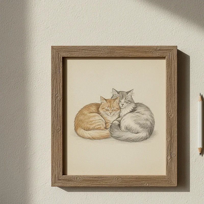Double the cats means double the cuteness in this heartwarming drawing idea. Sketch two feline friends nestled against each other, perhaps with heads touching or one cat draped over the other. This composition teaches you about creating relationships between subjects and balancing multiple forms in one drawing. Consider varying the cats' sizes or colors to add visual interest and make each distinct. Pay attention to how their bodies mold together, with fur overlapping and limbs intertwining naturally. The peaceful expressions and relaxed poses convey companionship and trust. This drawing works wonderfully for exploring different textures if you choose different fur patterns for each cat. The emotional warmth of the scene creates artwork that resonates deeply with viewers.