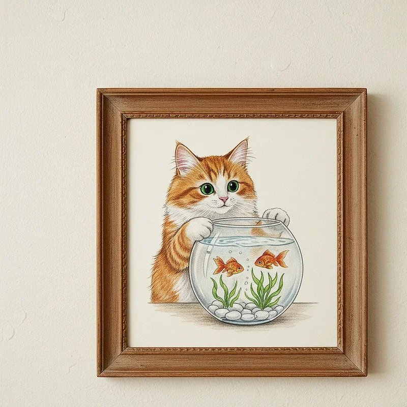 This classic scenario captures mischievous intent in one simple composition. Draw a cat sitting beside a fishbowl, eyes fixed intently on the fish inside, perhaps with one paw pressed against the glass. The scene tells an immediate story that everyone understands, creating humor and narrative tension. The transparent bowl provides excellent practice for drawing glass and water reflections. Inside, sketch a small goldfish, blissfully unaware of the predatory attention. The cat's focused expression, with dilated pupils and forward-pointing whiskers, conveys that hunting instinct perfectly. You can add motion lines or thought bubbles for extra storytelling. This drawing idea combines character, environment, and narrative effectively while remaining simple enough for artists at various skill levels.