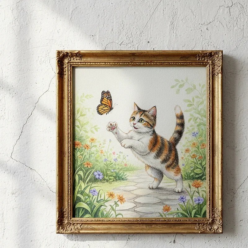 This whimsical scene combines nature's beauty with feline curiosity in one enchanting composition. Draw your cat in an alert, focused pose with one paw raised toward a delicate butterfly hovering nearby. The interaction creates narrative tension and movement without requiring complex action poses. Make the cat's eyes track the butterfly's position, adding intensity to the gaze. The butterfly itself offers opportunities to add color and delicate detail that contrasts with the cat's solid form. Consider drawing this scene outdoors with some simple grass or flowers to establish setting. This drawing idea teaches you about creating relationships between multiple subjects while maintaining a lighthearted, magical atmosphere that viewers find captivating and joyful.