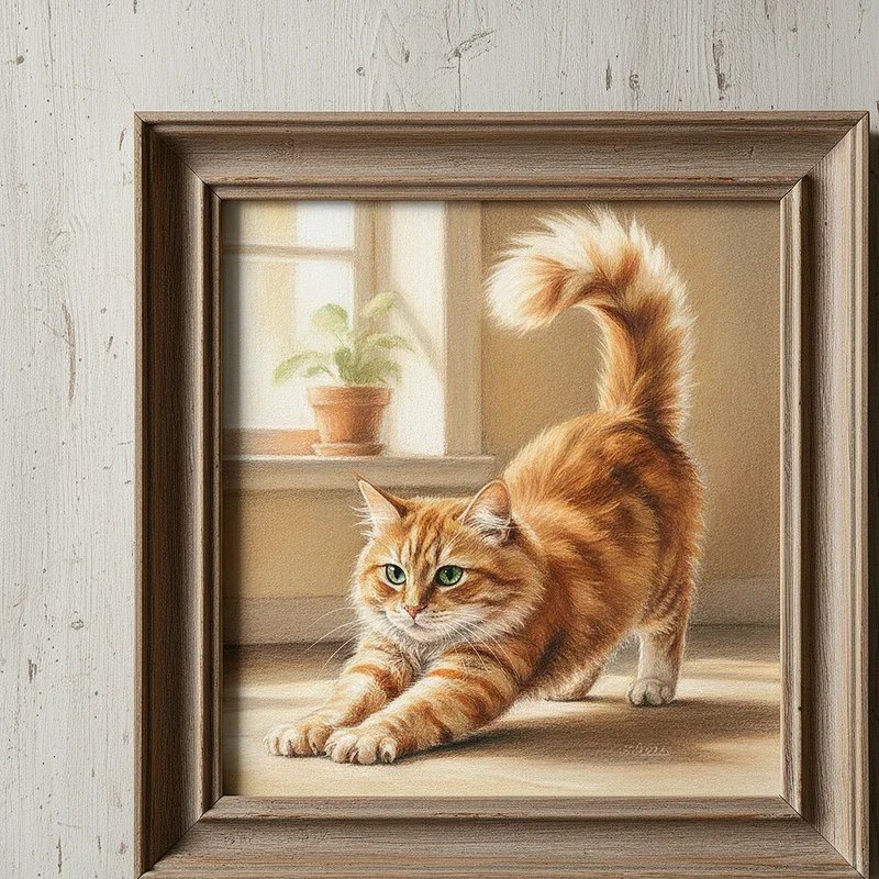 Cats spend countless hours grooming, making this an authentic and recognizable pose for your artwork. Draw your cat sitting with one leg extended upward, head tilted down as the tongue reaches toward the paw. This position demonstrates impressive flexibility and creates interesting angular shapes in your composition. Pay attention to the curved spine and how the body compresses on one side while stretching on the other. The grooming pose lets you practice foreshortening with the extended leg coming toward the viewer. Add details like closed eyes showing concentration and perhaps some motion lines near the grooming area. This everyday behavior makes your drawing feel genuine and alive, capturing a slice of real feline life that viewers immediately recognize and appreciate.