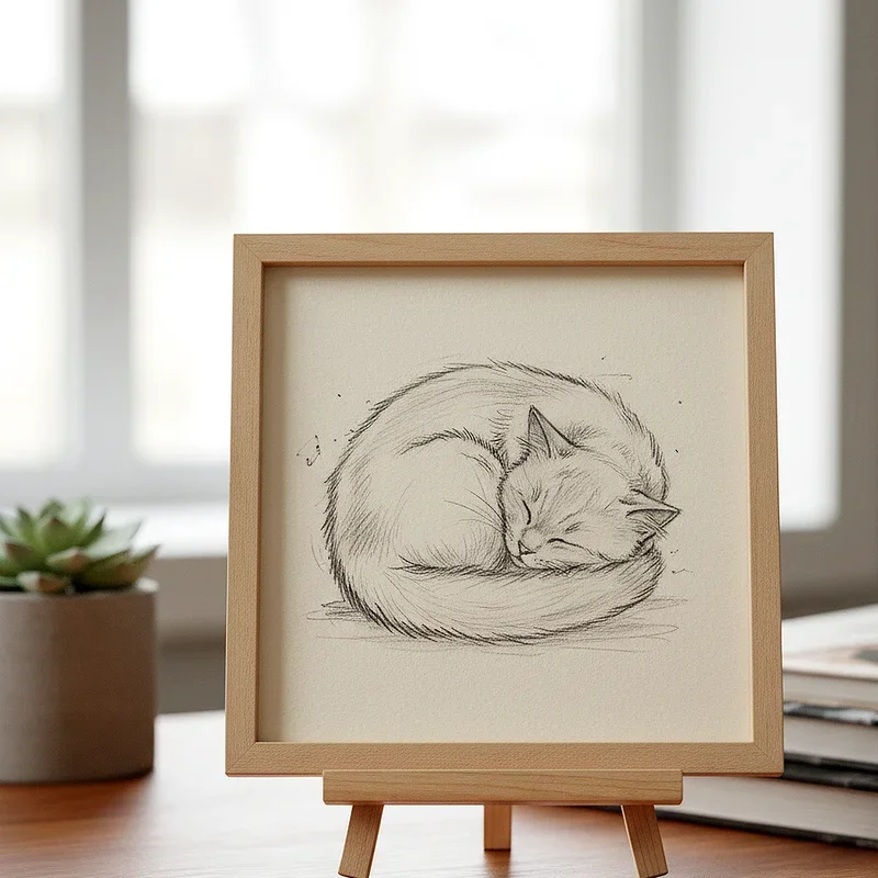 Drawing a sleeping cat curled into a cozy ball captures one of the most peaceful moments in feline life. Start by sketching a circular shape as your foundation, then add the curved spine and tucked paws. The beauty of this pose lies in its simplicity and the serene expression you can create on the cat's face. Pay attention to how the tail wraps around the body, creating a perfect circle of comfort. This drawing idea works wonderfully for beginners because the curled position naturally hides complex anatomy. You can add soft shading to emphasize the fluffy texture of the fur and create depth. Consider placing your sleeping cat on a cushion or blanket to add context and make the scene even more inviting and heartwarming.
