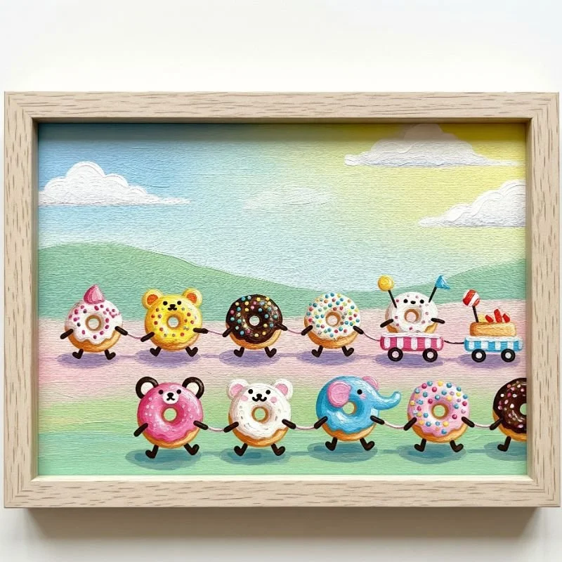 Create a delicious lineup that's calorie-free and forever fresh! Start with basic donut shapes: circles with smaller circles cut from their centers. The magic happens with the toppings. Pink icing, chocolate glaze, rainbow sprinkles, and vanilla drizzle transform simple shapes into treats. Use thick paint for dimensional icing effects. Add personality with tiny faces peeking through donut holes or happy expressions on the icing. Create variety with different decorations: colored sprinkles (tiny lines), chocolate chips (dots), or crushed nuts (small dashes). Line them up in rows or scatter them playfully across your canvas. Pastel backgrounds make the bright colors pop. This painting is perfect for beginners because donuts are forgiving shapes. Uneven circles? That's just homemade charm! Practice color combinations while creating art sweet enough for any space.