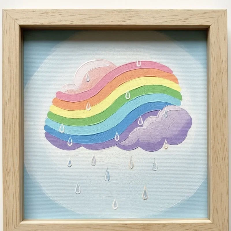 Why settle for ordinary weather when you can paint pure happiness? This cheerful cloud starts as a fluffy white shape made with circular dabbing motions. Give it rosy cheeks and a sweet smile because happy clouds make the best rain! Beneath your cloud, paint a vibrant rainbow using confident arcs. Don't stress about perfect curves; slightly wavy lines add charm. Instead of traditional rain, create colorful droplets in rainbow hues falling from your cloud. Use teardrop shapes in red, orange, yellow, green, blue, and purple. Vary their sizes and angles for natural movement. Add tiny highlights to each drop for dimension. The background can be soft blue or even leave it white for a clean look. This painting spreads joy wherever it hangs. It's perfect for practicing color order while creating something that makes everyone smile. Rainy days never looked so delightful!