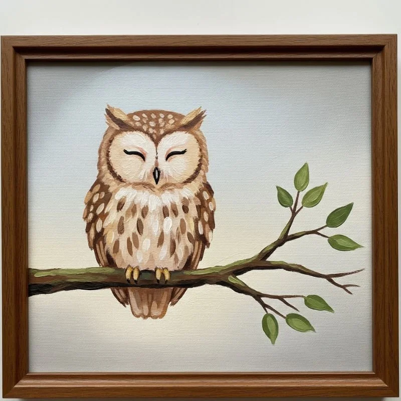 Whooo doesn't love a drowsy owl? This nocturnal cutie starts with a simple egg shape for the body. Add a smaller circle on top for the head, blending where they meet. Create sleepy eyes with downward curved lines and add a tiny orange triangle beak. The key to adorable owls? Big eyes and fluffy textures! Use short, feathery brushstrokes in browns, grays, and whites to create soft plumage. Add wing shapes on the sides with scalloped edges for feather detail. Perch your owl on a simple branch with tiny talons gripping tight. A crescent moon and a few stars complete the nighttime scene. For extra charm, add a tiny sleeping cap or have the owl hugging a miniature pillow. This painting teaches texture techniques while creating a soothing piece perfect for bedrooms. Sweet dreams are guaranteed