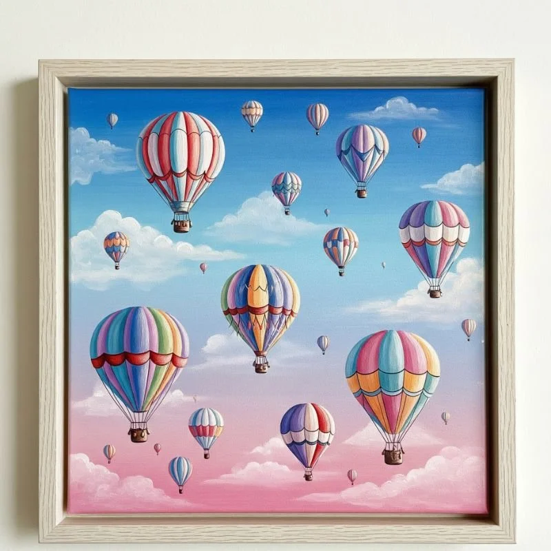 Lift your spirits with whimsical hot air balloons floating across your canvas! Paint teardrop shapes with baskets hanging below, connected by simple lines. Each balloon gets its own personality through patterns and colors. Try stripes, chevrons, polka dots, or rainbow sections. Use bright, cheerful colors that make you happy. The baskets are small rectangles or trapezoids with crisscross patterns. Add tiny stick figure passengers waving from their aerial adventure. Scatter balloons at different heights and sizes for visual interest. Fluffy white clouds become resting spots or obstacles to navigate around. A blue sky background makes colors pop, but sunset skies work beautifully too. This painting celebrates adventure and freedom. The repetitive shapes are meditative to create while allowing endless variety. Float away your worries with each brushstroke. Where are your balloons traveling today?