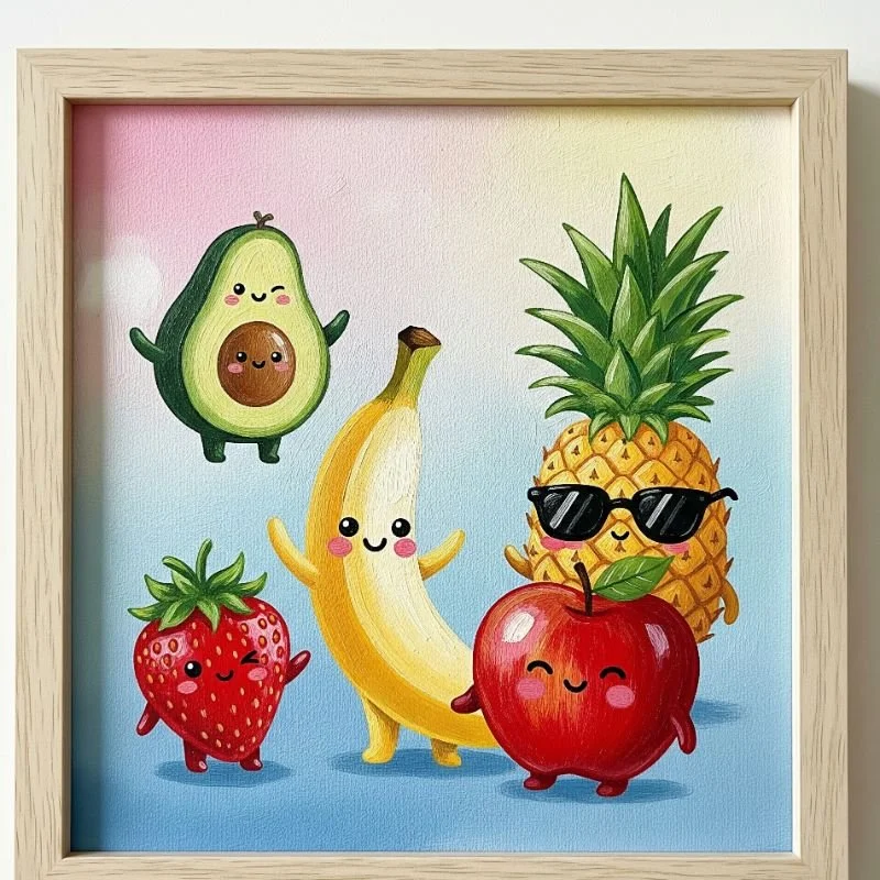 Transform ordinary fruit into extraordinary friends with faces that radiate pure joy! Start with simple fruit shapes: circular oranges, teardrop strawberries, crescent bananas, and oval avocados. The kawaii magic happens with expressions. Add dot eyes, curved smiles, and rosy cheeks to each fruit. Strawberries wear their seeds like freckles, watermelon slices show off their pink insides with black seed smiles, and pineapples rock their spiky crowns like punk hairstyles. Use bright, juicy colors that make mouths water. Add tiny arms and legs for fruits caught mid-dance. Create fruit salad scenes where different fruits hang out together. This painting style celebrates cuteness overload while practicing basic shapes and expressions. Perfect for kitchens or kids' rooms, these fruity friends remind us that healthy eating can be fun.