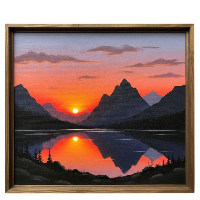 Master the art of simplicity with mountain silhouettes against a glowing sunset sky! Start by painting horizontal stripes across your canvas in sunset colors: deep purple at top, flowing through pink, orange, and yellow near the horizon. Blend while wet for smooth transitions. Once dry, add mountain shapes using black or dark purple paint. Layer them with tallest peaks in back, smaller ones in front for depth. The jagged edges are easy; just make triangular shapes with uneven tops. Add a few simple pine trees in the foreground using triangular shapes. The contrast between the dark silhouettes and bright sky creates instant drama. This technique is incredibly forgiving since silhouettes hide details. For extra magic, add a few birds flying home as simple "V" shapes. This painting proves that sometimes less really is more