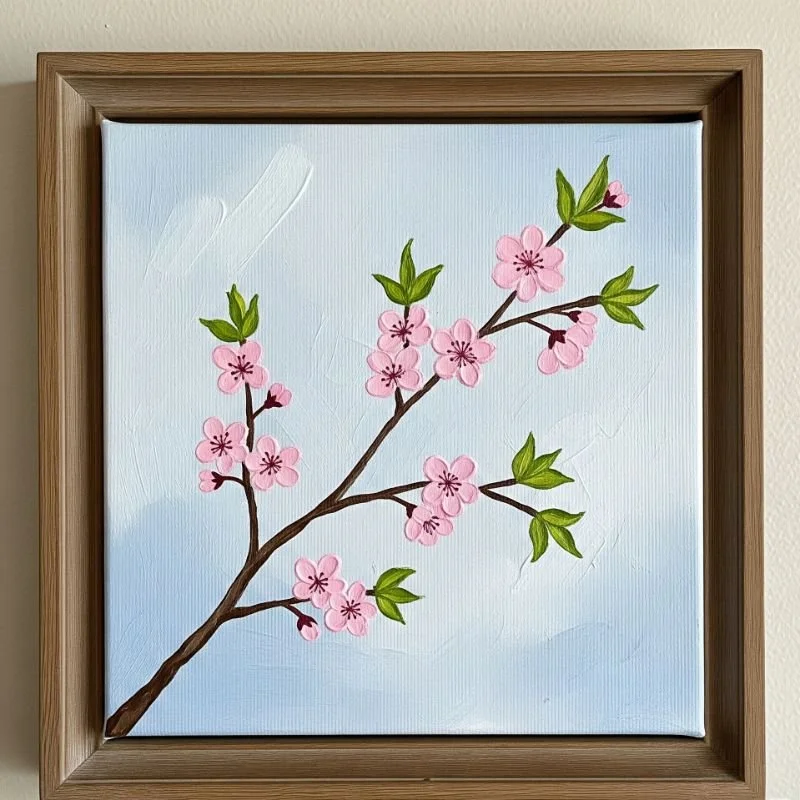 Capture spring's fleeting beauty with a cherry blossom branch that blooms eternal on your canvas! Start with a dark brown branch using confident, slightly wobbly strokes. Remember, perfectly straight branches don't exist in nature! Add smaller twigs branching off at angles. Now for the fun part: pink blossoms! Use a flat brush to dab five-petaled flowers in varying shades of pink and white. Some flowers face forward, others show their sides. Add unopened buds using small pink ovals. The secret to authentic-looking blossoms? Layer your colors. Start with darker pink, add lighter pink on top, then finish with tiny white highlights. Scatter some falling petals around your branch for movement. A soft blue or cream background makes the delicate flowers stand out. This painting teaches the beauty of imperfection. Each blossom is unique, just like in real life!