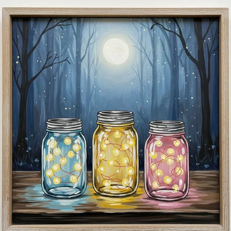Capture magical moments in painted mason jars that glow with possibility! Paint jar shapes using rectangles with slightly curved sides and add the signature ridged top with horizontal lines. Inside each jar, create a constellation of tiny fairy lights using small yellow and white dots connected by thin gray lines. The lights should look casually tangled, creating beautiful chaos. Add a soft glow effect by dry brushing yellow around each light dot. Decorate jar lids with twine bows or metal details. Create a collection with different colored lights: warm white, multicolor, or soft pink. Place jars on a simple wooden shelf line or floating in dreamy space. This painting brings cozy vibes to any room. The combination of rustic jars and twinkling lights creates instant ambiance. Perfect for those who love farmhouse charm with a touch of magic