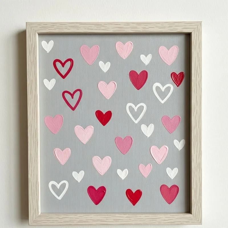 Sometimes the simplest ideas create the biggest impact! Fill your canvas with hearts in various sizes using a cohesive color palette. Try ombre effects with hearts gradually changing from dark to light pink. Create patterns: rows of uniform hearts, scattered confetti-style arrangements, or radiating designs from a central point. Experiment with heart styles: classic curves, geometric angles, or hand-drawn wobbles. Use negative space wisely; not every inch needs filling. Add interest with outline hearts mixed among solid ones. This project teaches color harmony and composition without overwhelming detail. Perfect for Valentine's Day or any day needing extra love. The repetitive nature becomes meditative while allowing creative freedom in arrangement. Hang in bedrooms, nurseries, or anywhere needing a love boost. These hearts prove that minimalism can still pack maximum cuteness