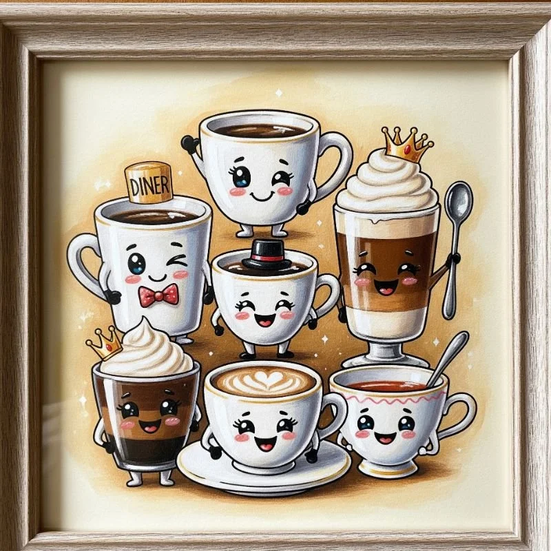 Turn your caffeine addiction into adorable art with coffee cups that have more personality than your morning barista! Paint simple mug shapes using rectangles with curved bottoms and add handles with "C" shapes. Each cup gets its own face and personality. Sleepy eyes for decaf, wide-awake excitement for espresso, or heart eyes for that perfect latte. Add steam swirls above each cup using loose, curvy lines. Decorate your mugs with patterns: polka dots, stripes, or tiny hearts. Include fun details like marshmallows with faces peeking out of hot chocolate or a cinnamon stick friend. Use warm browns, creamy whites, and soft pastels. Create a coffee shop scene with multiple cups having conversations. This painting celebrates our love affair with warm beverages while practicing facial expressions. Your kitchen will thank you for this cozy artwork!