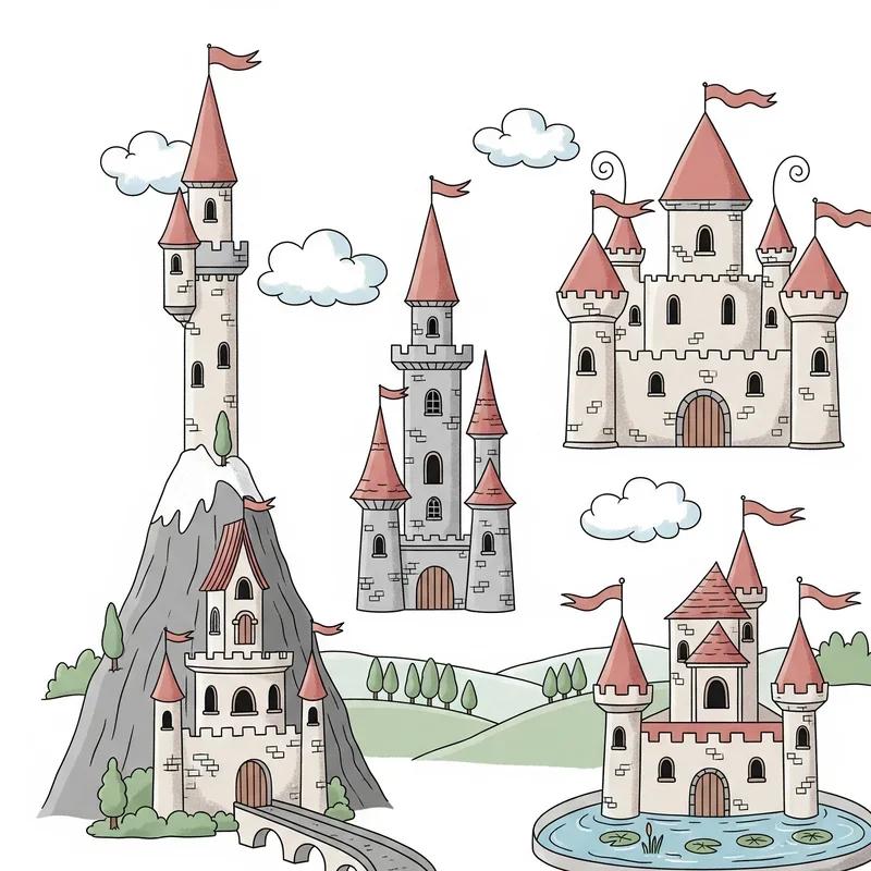 Build magnificent castles where every tower tells a story and every window holds possibilities for grand adventures! Drawing castles lets you become an architect of dreams, designing everything from romantic palace spires to mysterious fortress walls. Start with basic geometric shapes like rectangles for walls, triangles for roofs, and cylinders for towers. Then add the magical details that bring your castle to life: fluttering flags, arched doorways, elaborate windows, and perhaps a drawbridge over a moat. Your castle might sit atop a cloudy mountain, rise from a misty lake, or stand proudly in a flowering meadow. Add surrounding elements like winding paths, royal gardens, or dragons circling overhead. Consider who lives in your castle and let that inspire unique features like a tower observatory for a star-gazing princess or a grand library for a scholarly queen. Each castle you create becomes a gateway to countless stories waiting to unfold.