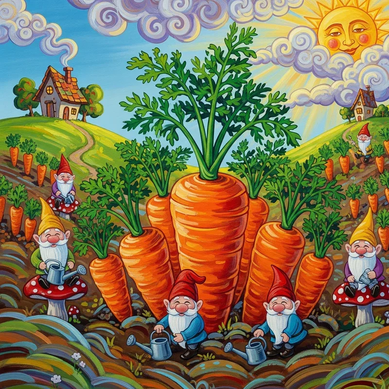 Transport viewers into a magical garden where carrots grow in abundance, ready for the Easter bunny's visit. Create rows of carrot tops sprouting from the soil, their feathery leaves creating interesting patterns and textures. Perhaps add a bunny or two hopping between the rows, leaving tiny paw prints in the soft earth. Include garden elements like a miniature fence, watering can, or gardening tools to establish the setting. You might show some carrots partially pulled from the ground, revealing their orange roots beneath the green tops. Consider adding whimsical touches like a sign reading "Bunny's Garden" or butterflies fluttering among the carrot greens. This scene allows you to practice perspective with the garden rows while creating a charming narrative that connects gardening with Easter traditions.