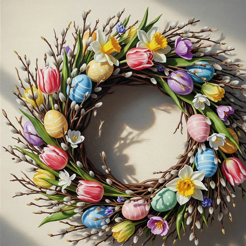 Design a decorative Easter wreath that combines traditional circular composition with seasonal elements. Start with the wreath's base structure, whether it's made of twigs, vines, or greenery. Layer Easter-themed decorations throughout, such as small eggs, miniature bunnies, spring flowers, and ribbons. Consider how elements flow around the circle, creating movement and visual rhythm. Vary the sizes and types of decorations to avoid monotony while maintaining overall balance. Perhaps include a bow at the bottom or top as a focal point. Add depth by showing how some elements sit in front of others, creating a three-dimensional feel. This drawing teaches you about circular composition, balance, and how to arrange multiple elements harmoniously. The wreath format also works beautifully as a frame for other Easter imagery if you choose to add a central element.