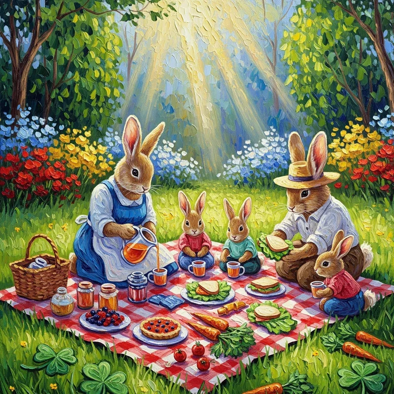 Create a heartwarming scene featuring a bunny family enjoying a springtime picnic together. Arrange parent bunnies and their little ones on a checkered blanket, surrounded by picnic foods with an Easter twist. Include items like carrot sandwiches, lettuce salads, and decorated egg-shaped cookies in your spread. Give each family member distinct characteristics through size, ear positions, and facial expressions that suggest their personalities. Perhaps one bunny kit reaches for a treat while another plays with a colorful Easter egg. Add environmental details like a picnic basket, wildflowers scattered in the grass, and maybe a kite flying in the background. This narrative drawing allows you to practice character design, create relationships between figures, and build a scene that tells a complete story about family togetherness during Easter.