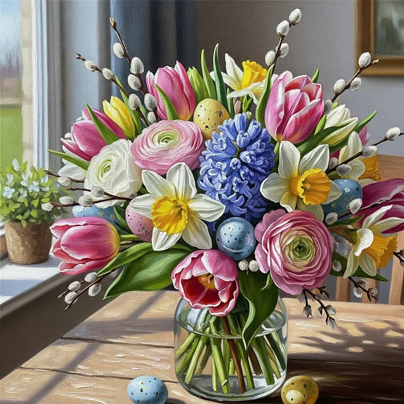 Combining traditional spring flowers with Easter symbols creates a drawing that perfectly captures the season's essence. Start your composition with a variety of blooms like tulips, daffodils, and hyacinths arranged in a pleasing bouquet shape. Weave in Easter elements by tucking small decorated eggs among the petals or adding a tiny bunny peeking out from behind the stems. Consider including pussy willows or flowering branches to add height and movement to your arrangement. Pay attention to how different flower shapes complement each other, creating visual harmony through variety. You can wrap the bouquet with a festive ribbon featuring pastel colors or Easter patterns. This drawing idea allows you to practice botanical illustration while incorporating holiday themes, resulting in artwork that celebrates both nature's renewal and Easter traditions.