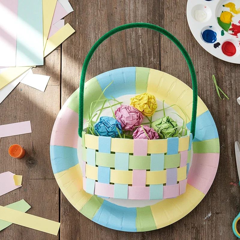 Reimagine humble paper plates as colorful woven Easter baskets through this clever painting and crafting technique perfect for children. Cut the center from a paper plate, leaving a two-inch rim, then paint it in bright Easter colors completely. Slice the rim into strips while leaving them attached at the base, creating your weaving foundation structure. Paint additional paper strips in coordinating colors and weave them through the plate strips for a basket effect. Attach a painted paper handle and fill your creation with paper grass and painted wooden eggs for display. This eco-friendly project teaches kids about recycling while developing fine motor skills and creativity, making it ideal for classroom parties or rainy day activities that keep little hands busy and engaged.