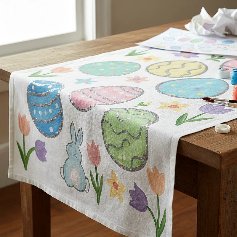 Design a custom Easter tablecloth that becomes a cherished family heirloom by decorating plain fabric with permanent fabric paints. Choose a white or cream cotton tablecloth as your base, washing and ironing it before starting your masterpiece. Create border designs featuring Easter eggs, spring flowers, and hopping bunnies using stencils or freehand painting techniques. Encourage family members to add their handprints in pastel colors, signing their names and the year beside them. Heat-set your painted designs according to paint manufacturer instructions to ensure your artwork survives multiple washings and uses. This functional art piece makes every Easter meal special while preserving memories of family gatherings, becoming more precious as years pass and new handprints join the collection.