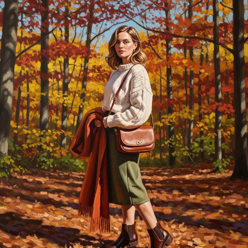 Merge fashion with fall by painting figures dressed in cozy autumn attire! Focus on textures: chunky knit sweaters, wool scarves, leather boots, and corduroy jackets. Paint your figure in a fall setting, perhaps walking through a park with leaves swirling or sitting on a bench with a warm beverage. Use the clothing to echo fall colors: rust-colored coats, mustard scarves, burgundy hats. Show movement through flowing scarves or coat hems caught by autumn breeze. Include seasonal accessories like plaid blankets or canvas tote bags filled with apples. The background should complement but not overwhelm: soft-focus trees or a simple autumn color wash. This contemporary take on fall painting appeals to fashion lovers while celebrating seasonal style. Capture that cozy, layered look that makes everyone love fall fashion!