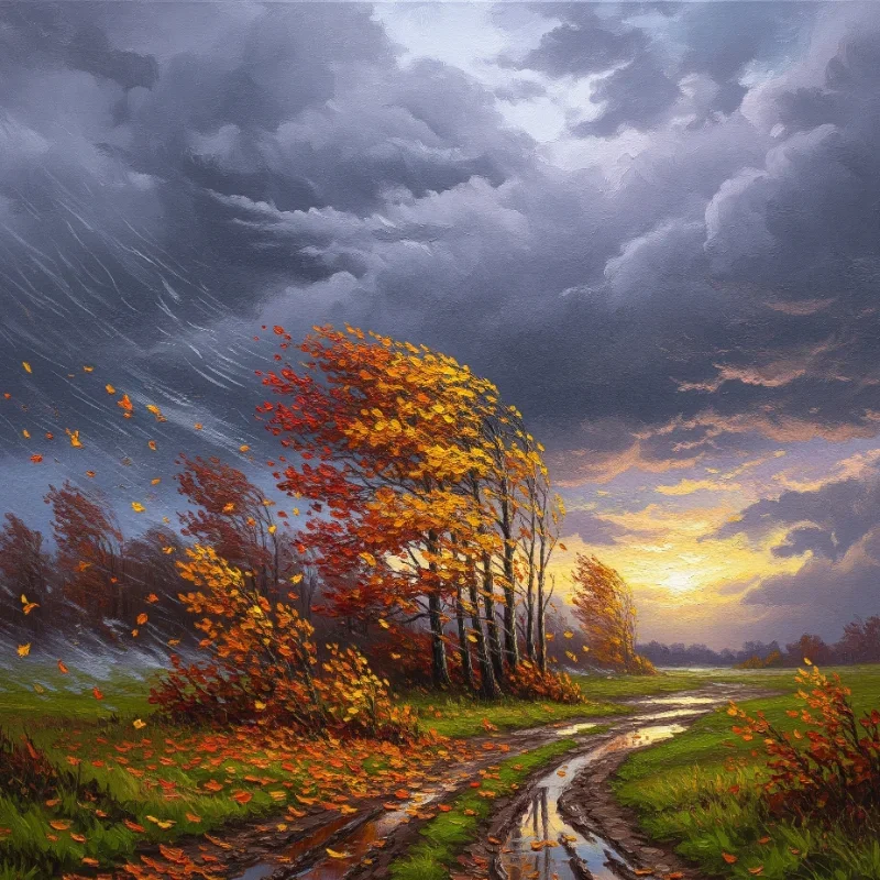 Capture fall's dramatic moods with storm clouds rolling over autumn landscapes! These scenes prove fall isn't always about sunny days and clear skies. Build your storm clouds in layers, using grays, purples, and deep blues. Leave breaks where sunlight streams through, dramatically illuminating patches of golden trees below. This contrast between dark sky and bright foliage creates incredible visual tension. Show wind effects: trees bending, leaves swirling, perhaps rain in the distance as a gray veil. Include elements that emphasize the approaching storm: birds flying to shelter, or a farmhouse with windows glowing warmly against the darkening sky. Use diagonal brushstrokes in the sky to suggest movement and energy. The foreground might show the last bright moments before the storm hits. This painting style captures autumn's wild side and creates mood through atmospheric drama!