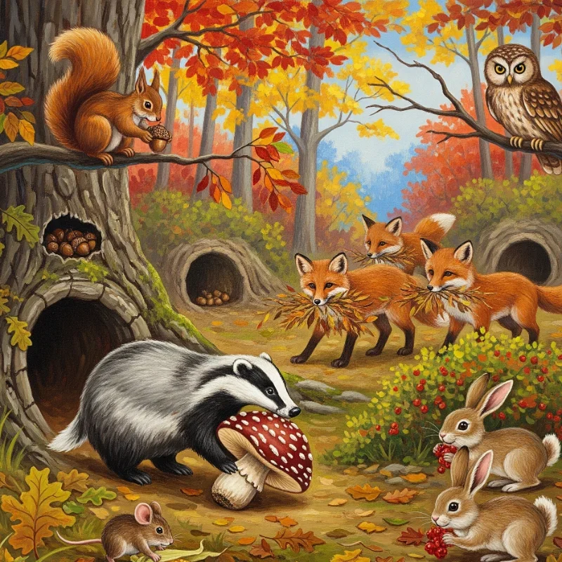 Bring autumn to life by painting forest animals in their fall activities! Show squirrels gathering acorns, their cheeks comically stuffed while more nuts overflow from their tiny paws. Paint deer in their darker winter coats against golden forest backdrops. Include birds like blue jays caching seeds or geese flying south in V-formation. Each creature tells a story of autumn preparation: a rabbit fattening up on clover, a raccoon washing persimmons in a stream, or a fox stalking through fallen leaves. Use the animals to add scale and life to your landscape. Their activities create narrative: follow a chipmunk's path from tree to burrow, showing scattered shells along the way. Combine multiple species in one scene for a busy woodland tableau. This approach makes autumn paintings more dynamic and reminds viewers that fall is about more than just pretty leaves!