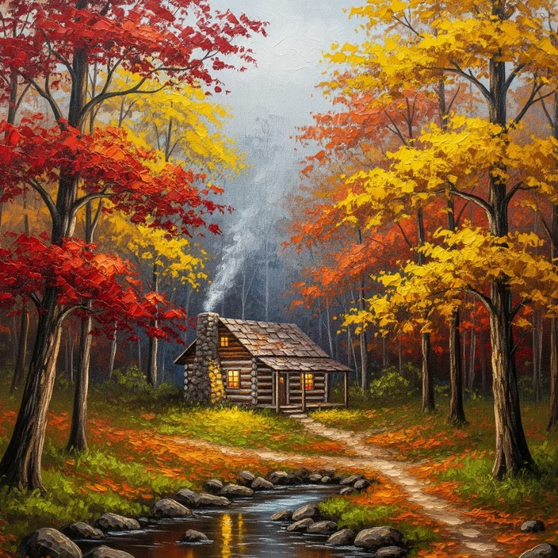 Transport viewers to their dream autumn retreat with a cozy cabin nestled among fall foliage! Position your cabin slightly off-center, using the rule of thirds for visual interest. Start with basic shapes: rectangles for walls, triangles for roofs, but add character through details like weathered wood siding and stone chimneys. Smoke curling from the chimney suggests warmth inside while cool autumn air surrounds. Frame your cabin with trees in full fall glory, using varied heights and colors to avoid monotony. A wooden fence or stone path leads the eye toward the cabin door. Add lifestyle details: stacked firewood, a porch swing, maybe pumpkins on the steps. Windows should glow warmly, suggesting lamplight within. Use cooler colors in shadows to contrast with warm autumn tones. This painting sells the fantasy of fall retreat living, making viewers want to curl up inside with hot cocoa and a good book!