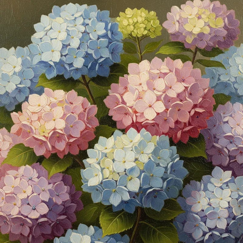 Create nostalgic charm by painting hydrangea clusters in vintage botanical style, emphasizing muted colors and soft edges. Start with large, rounded flower clusters using various shades of blue, purple, pink, or antique white. Build individual florets using four-petaled shapes, varying their size and orientation for natural appearance. Add aging effects by incorporating brown and sepia tones into your color palette. Use dry brush techniques to suggest texture and create that time-worn appearance. Include detailed leaves with visible veins and slightly yellowed edges. This project teaches color temperature manipulation and how to create cohesive color harmony using muted tones. You'll learn to balance detail with overall impression, as hydrangeas require suggesting hundreds of tiny flowers without painting each one. The result evokes grandmother's garden or vintage wallpaper, bringing timeless elegance to contemporary spaces.