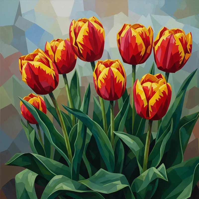 Transform traditional flower painting by incorporating geometric shapes into organic tulip forms. Start by sketching tulips using triangles and diamonds as building blocks, then soften some edges while keeping others sharp. This contemporary approach bridges the gap between abstract and representational art. Choose a limited color palette, perhaps three shades of red or pink, to maintain visual cohesion. Fill each geometric section with flat color or subtle gradients, creating a stained-glass effect. This project enhances your understanding of shape relationships and color theory. You'll learn how geometric interpretation can modernize classical subjects and how mathematical precision can coexist with artistic expression. The result is a striking piece that appeals to both traditional flower art lovers and contemporary design enthusiasts, perfect for modern living spaces seeking botanical elements with an edge.