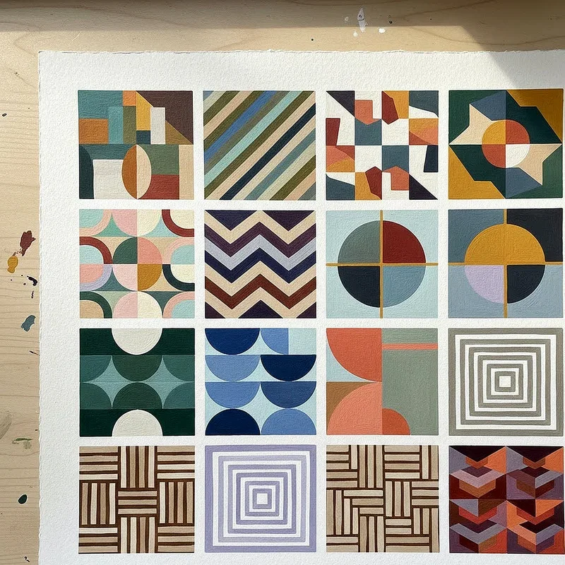Minimalist geometric patterns highlight gouache's precision and its ability to create perfectly flat, uniform color fields that are essential for clean, modern designs. Use masking tape or stencils to achieve crisp edges, exploring how simple shapes and limited color palettes can create sophisticated, visually striking compositions. The medium's consistency allows for smooth, streak-free coverage that's crucial for minimalist aesthetics where every imperfection becomes noticeable. Experiment with repetition, rhythm, and negative space to understand fundamental design principles that apply across all artistic disciplines. This approach develops your technical control with gouache while training your eye to appreciate the power of simplicity and restraint in artistic expression.