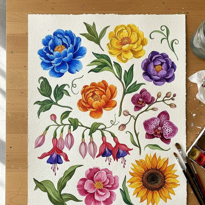 Botanical illustrations showcase gouache's ability to capture both delicate details and bold, saturated colors that make flowers pop off the page. Begin with light washes to establish your flower's basic shape, then gradually build up layers to create depth and dimension in petals and leaves. The medium's matte finish beautifully captures the velvety texture of rose petals or the waxy surface of tropical blooms. You can achieve incredible detail by using small brushes with thick gouache for stamens, pistils, and fine veining on leaves. This subject matter helps develop your color mixing skills while teaching you how gouache behaves differently at various consistencies, from thin glazes to thick impasto applications.
