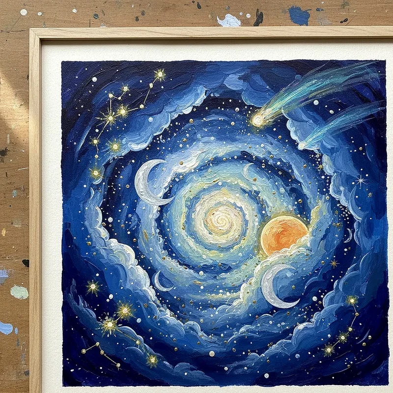 Night sky paintings demonstrate gouache's remarkable ability to create luminous effects against dark backgrounds, perfect for depicting stars, planets, and cosmic phenomena. Start with deep, rich backgrounds using prussian blue or payne's gray, then add celestial elements using various techniques from splatter for distant stars to detailed brushwork for planets. The medium's opacity allows you to paint bright stars and nebulae directly over dark skies without losing vibrancy or clarity. Experiment with adding the aurora borealis, meteor showers, or the milky way using thin glazes and dry brush techniques. These paintings teach you about creating light effects and atmospheric depth while exploring the mysterious beauty of our universe through artistic interpretation.