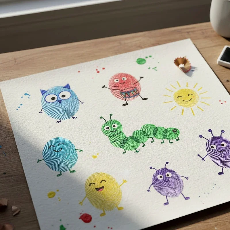 Transform simple fingerprints into elaborate scenes and characters using just fingers, ink pads, and imagination. Kids can create entire families of fingerprint people, turn prints into animals by adding ears and tails, or combine multiple prints to form flowers and butterflies. This tactile approach to drawing appeals to children who might feel intimidated by traditional drawing tools, as everyone's fingerprints are already unique and interesting. The activity teaches that art can start from anywhere, even something as simple as a thumb pressed on paper. Adding details with markers or crayons after the prints dry lets kids develop their fine motor skills gradually. From fingerprint forests to underwater scenes made entirely of colorful prints, this technique shows that masterpieces don't always require perfect lines or advanced skills.