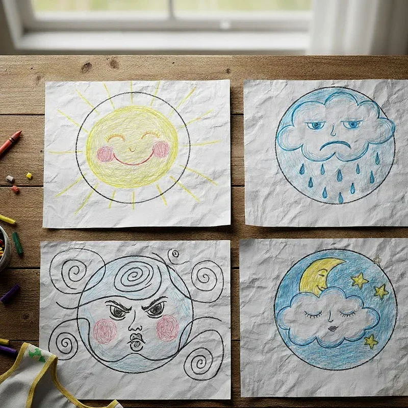 What if clouds had feelings and the sun could smile? This drawing idea combines weather education with emotional intelligence by having kids draw weather patterns as characters with distinct moods. A grumpy storm cloud might have furrowed eyebrows and lightning bolt tears, while a happy rainbow could be dancing across the sky with a huge grin. This activity helps children connect emotions with visual representations and understand that feelings, like weather, can change throughout the day. They might draw a nervous fog that's too shy to lift, or a confident wind that loves messing up people's hair. Adding speech bubbles where weather characters explain why they feel certain ways creates opportunities for discussing emotions in a fun, non-threatening way that resonates with young minds.