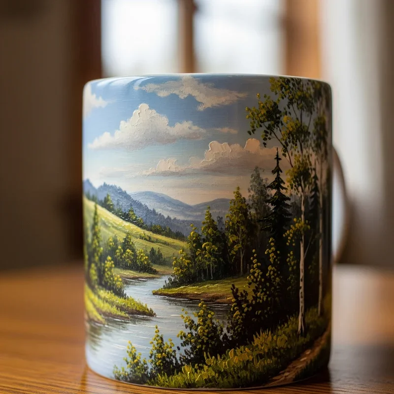 Paint miniature worlds on your mugs with landscape scenes featuring mountains, forests, beaches, or countryside vistas. Start with background elements like sky and distant mountains, then add middle ground and foreground details for depth. Simple silhouette landscapes work well for beginners, while advanced painters can include detailed trees, clouds, and reflections. Consider painting panoramic scenes that wrap around the entire mug, creating an immersive viewing experience. Sunset and sunrise scenes offer dramatic color opportunities with oranges, pinks, and purples. Add tiny details like birds, boats, or cabins to bring your landscapes to life. These scenic designs transport you to peaceful places with every sip, making them perfect for nature lovers or anyone needing daily escapes from urban environments.