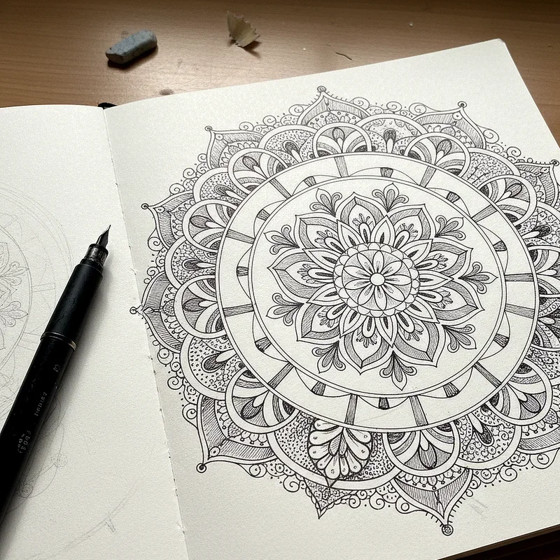 Creating mandalas and zentangles in your notebook provides a meditative drawing experience that combines artistic expression with mindfulness and stress relief through repetitive patterns. Start from a central point and work outward in circular patterns, or fill defined spaces with intricate designs that flow organically yet maintain structured beauty. These art forms don't require planning; they evolve naturally as you add each element, creating unique pieces that reflect your state of mind. The repetitive nature of drawing patterns calms racing thoughts while producing stunning artwork that seems complex but builds from simple repeated marks. You can create traditional circular mandalas, square designs, or free-form zentangles that fill entire pages with interconnected patterns and textures. This practice improves focus, patience, and fine motor control while producing notebook pages that double as meditation tools and decorative art pieces.