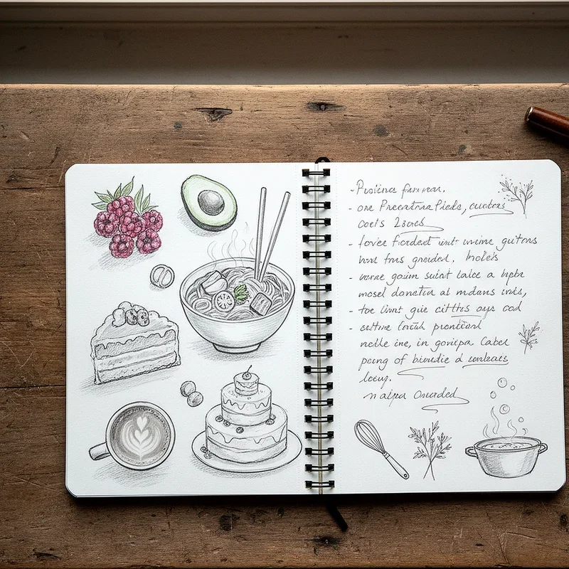 Combining your love for food with drawing creates delicious artwork that celebrates culinary creativity and makes your notebook a feast for the eyes. Sketch your morning coffee, illustrate your favorite recipes with step-by-step drawings, or create whimsical representations of ingredients dancing across the page. Food illustration doesn't require you to be a chef; it's about appreciating the colors, textures, and shapes that make each dish visually appealing. You can document memorable meals, create illustrated shopping lists, or design your dream menu with artistic flair that makes cooking more enjoyable. Add handwritten notes about flavors, cooking tips, or memories associated with certain dishes to create a personal cookbook that's uniquely yours. These illustrations become a delightful way to celebrate food culture while developing your ability to render different textures and compositions.