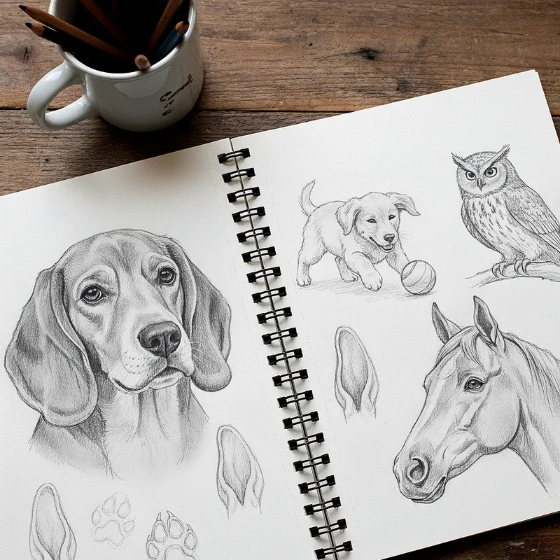 Capturing animals in your notebook challenges you to observe and render diverse textures, movements, and personalities that make each creature unique and captivating. Whether sketching your sleeping cat, birds at a feeder, or zoo animals, each subject teaches different lessons about proportion, gesture, and character. Focus on distinctive features like the curve of a cat's whiskers, the texture of fur or feathers, and expressions that reveal animal emotions. You can work from life, photographs, or combine references to create imaginative creatures that blend realistic observation with creative interpretation. Practice quick gesture drawings to capture movement and energy, then develop detailed studies that explore anatomy and surface textures more thoroughly. Animal drawing develops your ability to see and render organic forms while celebrating the beauty and diversity of the natural world.