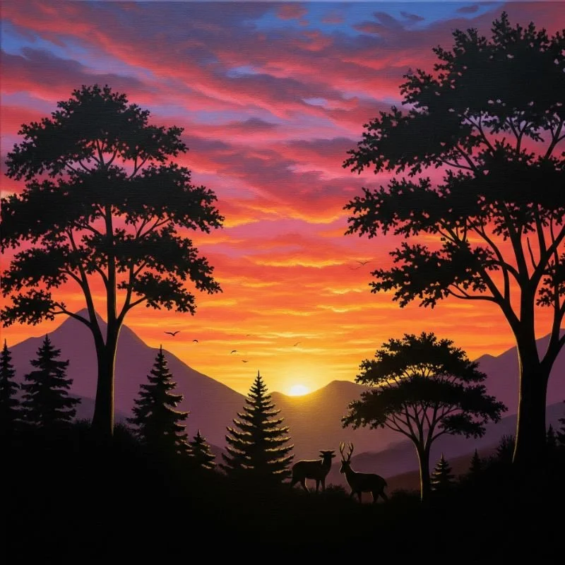 Picture this: a glowing sunset backdrop with dark tree silhouettes dancing across it. This technique combines simple shapes with gradient blending, perfect for beginners. Start by painting a sunset using horizontal brushstrokes, blending oranges, pinks, and purples. Once dry, paint black silhouettes of trees, birds, or mountains on top. The contrast creates instant drama! You'll learn color blending while the silhouettes hide any "mistakes" in your gradient. It's like nature's way of saying, "Hey, perfection is overrated!" Choose simple shapes like pine trees or flying birds for best results.