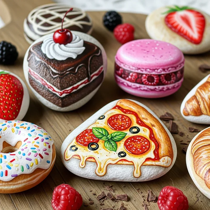 Food art stones satisfy creative appetites by recreating favorite treats in permanent, calorie-free form that looks good enough to eat but lasts forever as delightful decorative pieces. Paint realistic donuts complete with sprinkles, pizza slices with bubbling cheese, or tropical fruits that showcase your ability to capture textures and colors accurately. These whimsical creations work wonderfully as play food for children's imaginative games or as kitchen decorations that celebrate culinary joy without cluttering counters. Add glossy varnish to simulate glazes, sauces, or juice that enhances the mouth-watering illusion while protecting your artwork from handling. Food stones make perfect gifts for foodies, restaurant owners, or anyone who appreciates humor in art, proving that creativity can transform any subject into something special worth displaying and discussing.