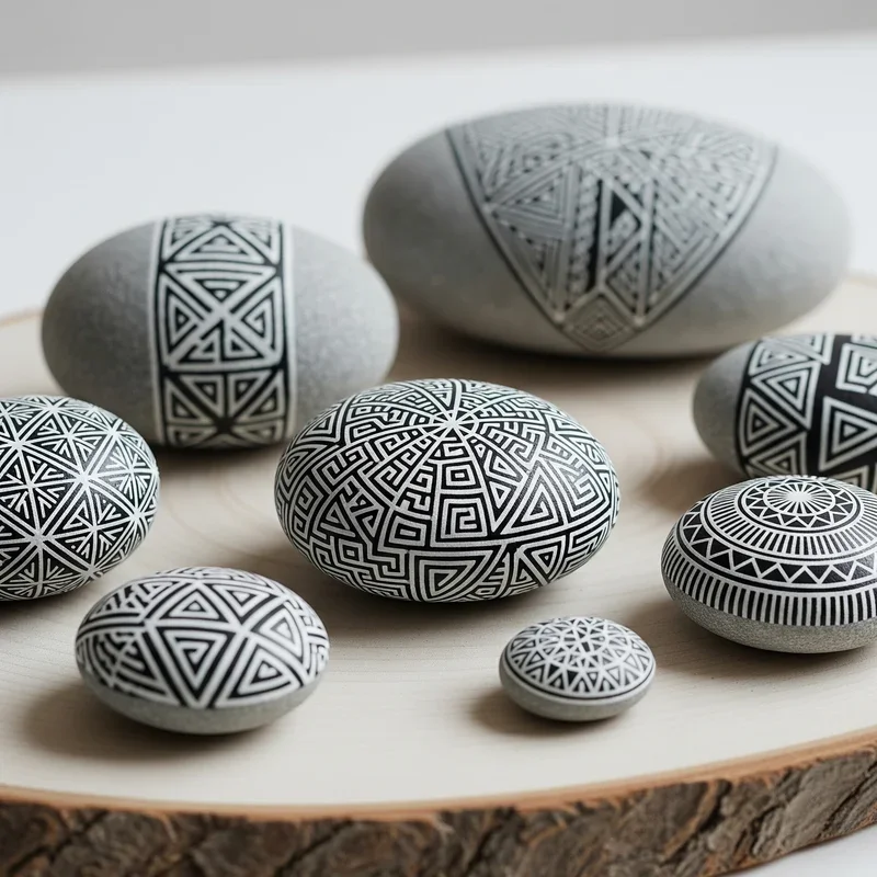 Geometric pattern stones appeal to contemporary aesthetics through clean lines, balanced compositions, and mathematical precision that creates visual harmony using basic shapes and limited color palettes. Employ masking tape to achieve crisp edges between colors, building complex designs from simple triangles, circles, and hexagons that interconnect in satisfying arrangements. These modern pieces complement minimalist interiors as subtle accent pieces that add visual interest without overwhelming spaces or competing with existing decor. Explore optical illusions through strategic color placement and pattern repetition that makes flat surfaces appear three-dimensional or creates movement in static designs. Geometric stones prove that sophistication doesn't require complexity, demonstrating how thoughtful restraint and careful execution produce elegant results that feel both timeless and thoroughly contemporary in their aesthetic appeal.
