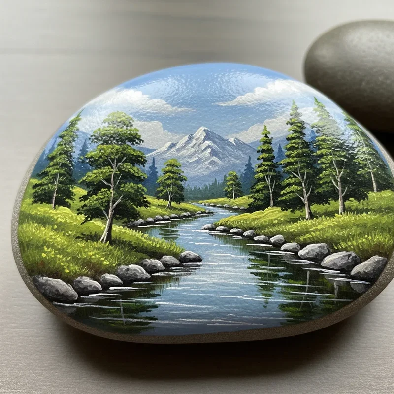 Nature scene stones compress vast landscapes into pocket-sized vistas that capture the essence of favorite places or dream destinations through carefully composed miniature paintings. Layer background mountains, middle-ground trees, and foreground details to create depth perception that draws viewers into these tiny worlds despite size limitations. Experiment with perspective techniques like atmospheric perspective where distant elements appear lighter and less detailed than closer objects, enhancing the illusion of space. These portable landscapes serve as meditation focal points, reminding us of peaceful moments spent in nature when daily stress demands grounding. Create series depicting seasonal changes in the same scene or document travels by painting landmarks from visited locations, building a unique collection of memories preserved in stone that fits in a single display box.
