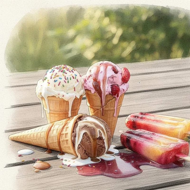 Nothing says summer quite like frozen treats melting in the sun! Drawing ice cream provides wonderful texture practice, from the rough waffle cone to smooth, swirling soft serve. You can play with different flavors using various color combinations and experiment with toppings like sprinkles, chocolate chips, or fresh fruit. Don't forget about those colorful popsicles either; their geometric shapes and vibrant hues make them perfect for practicing clean lines and gradient techniques. Try capturing that moment when ice cream starts to drip down the cone, adding movement and urgency to your sketch. These sweet subjects let you explore both realistic rendering and playful, stylized approaches that bring joy to any sketchbook page.