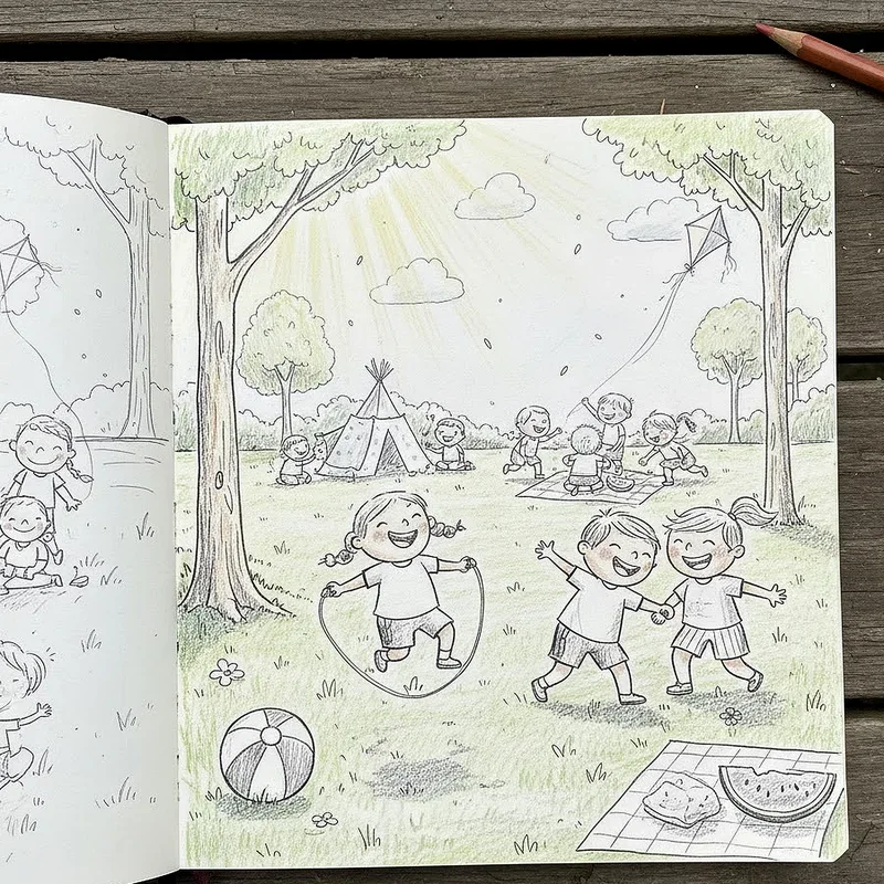 The joy of childhood summers comes alive through drawings of kids playing hopscotch, blowing bubbles, or running through sprinklers. These dynamic subjects help you capture movement and emotion while practicing figure drawing in casual, natural poses. Watch how children's bodies express excitement through exaggerated gestures and uninhibited movement. Drawing chalk art on sidewalks, building sandcastles, or chasing fireflies at dusk all tell stories of summer freedom. Include details like water droplets catching sunlight, bubble iridescence, or grass stains on knees for authenticity. The spontaneous nature of play creates interesting compositional challenges as figures overlap and interact. These scenes remind us that summer isn't just a season but a feeling of endless possibility and adventure that your drawings can preserve forever.