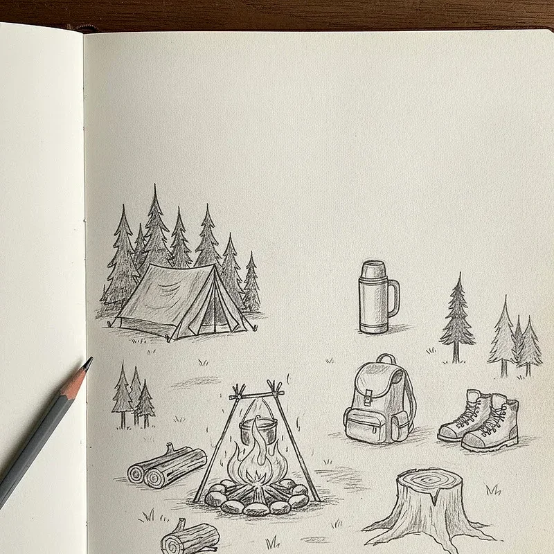 Nothing captures summer adventure quite like camping scenes with glowing bonfires under starry skies. These subjects combine multiple challenging elements: the warm glow of firelight, the contrast between bright flames and dark surroundings, and the cozy atmosphere of tents and camping gear. Practice drawing fire's unpredictable shapes and the way its light illuminates nearby objects and faces. Include details like marshmallow roasting sticks, camping chairs arranged in circles, and lanterns hanging from trees. The texture of canvas tents, sleeping bags, and rough tree bark adds variety to your drawings. Try capturing smoke wisps curling into the night sky or sparks flying upward like tiny stars. These scenes evoke feelings of adventure and connection with nature that define summer memories.
