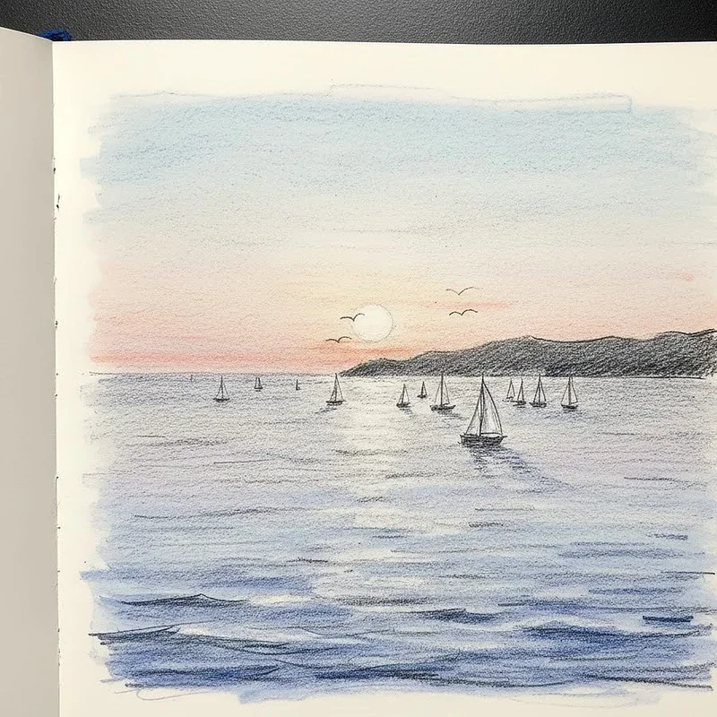There's something peaceful about watching sailboats glide across summer waters, their white sails catching the breeze. These nautical subjects teach you about proportion and scale, especially when drawing distant boats that appear tiny against vast ocean expanses. Practice capturing the way sails billow and curve in the wind, creating beautiful organic shapes against geometric boat hulls. Experiment with different weather conditions, from calm waters with perfect reflections to choppy seas with dynamic movement. Add details like colorful spinnakers, racing numbers, or people on deck to bring your boats to life. The interplay between boats, water, and sky creates natural compositions that guide the viewer's eye across your drawing. Include seabirds and clouds to complete your maritime masterpiece.