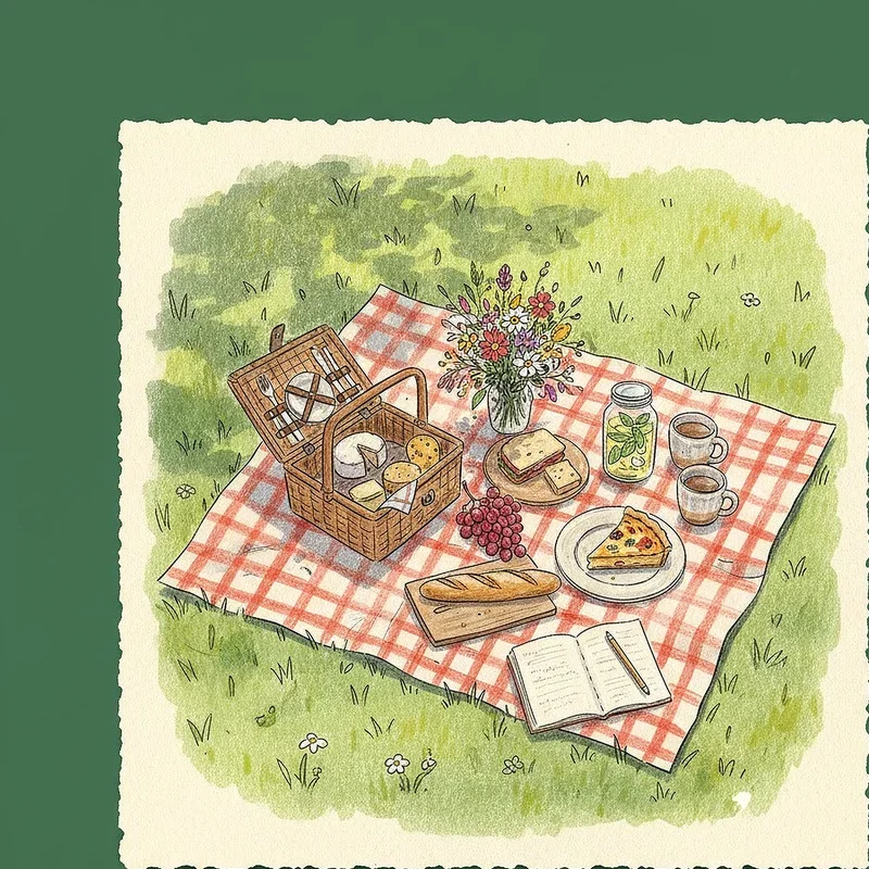 A checkered blanket laden with summer treats creates an inviting scene that combines food illustration with outdoor settings. Picture wicker baskets overflowing with fresh bread, cheese wheels, grape clusters, and mason jars filled with lemonade. These picnic scenes let you practice drawing various textures from crusty baguettes to smooth apple skins while working on composition and arrangement. Include details like vintage thermoses, folded napkins, and scattered wildflowers picked from nearby meadows. The dappled sunlight filtering through tree branches creates interesting shadow patterns across your picnic spread. Background elements like other picnickers, playing children, or lazy dogs add life to your scene. These drawings capture the leisurely pace of summer afternoons and the simple pleasure of eating outdoors with friends.