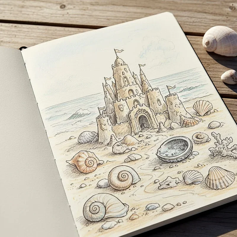 Beach treasures like shells and ambitious sand castles make perfect subjects for detailed studies or whimsical scenes. Each shell presents unique challenges with spiraling forms, ridged textures, and subtle color variations from pearl white to sunset orange. Arrange collections of shells, starfish, and sea glass for still life drawings that capture summer's beachcombing rewards. Sand castles let your imagination run wild, from simple bucket shapes to elaborate fortresses complete with moats and flags. The granular texture of sand, whether wet and compact or dry and flowing, requires different techniques to convey effectively. Add footprints, small crabs, or incoming waves threatening your castle for narrative elements. These subjects work well in both realistic and stylized approaches, making them accessible for artists at any skill level.